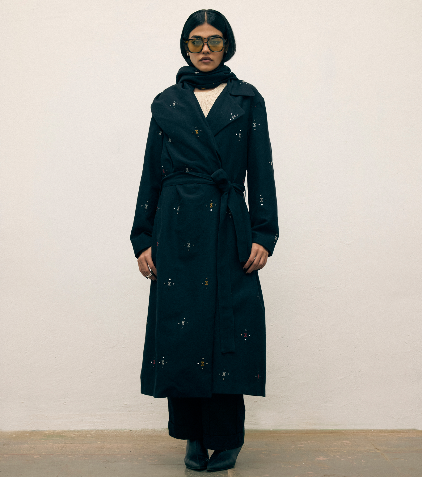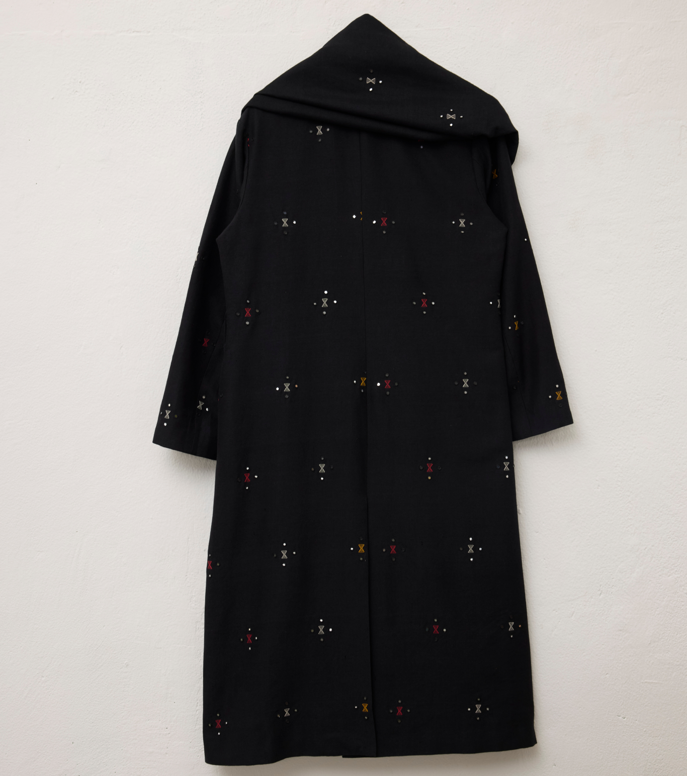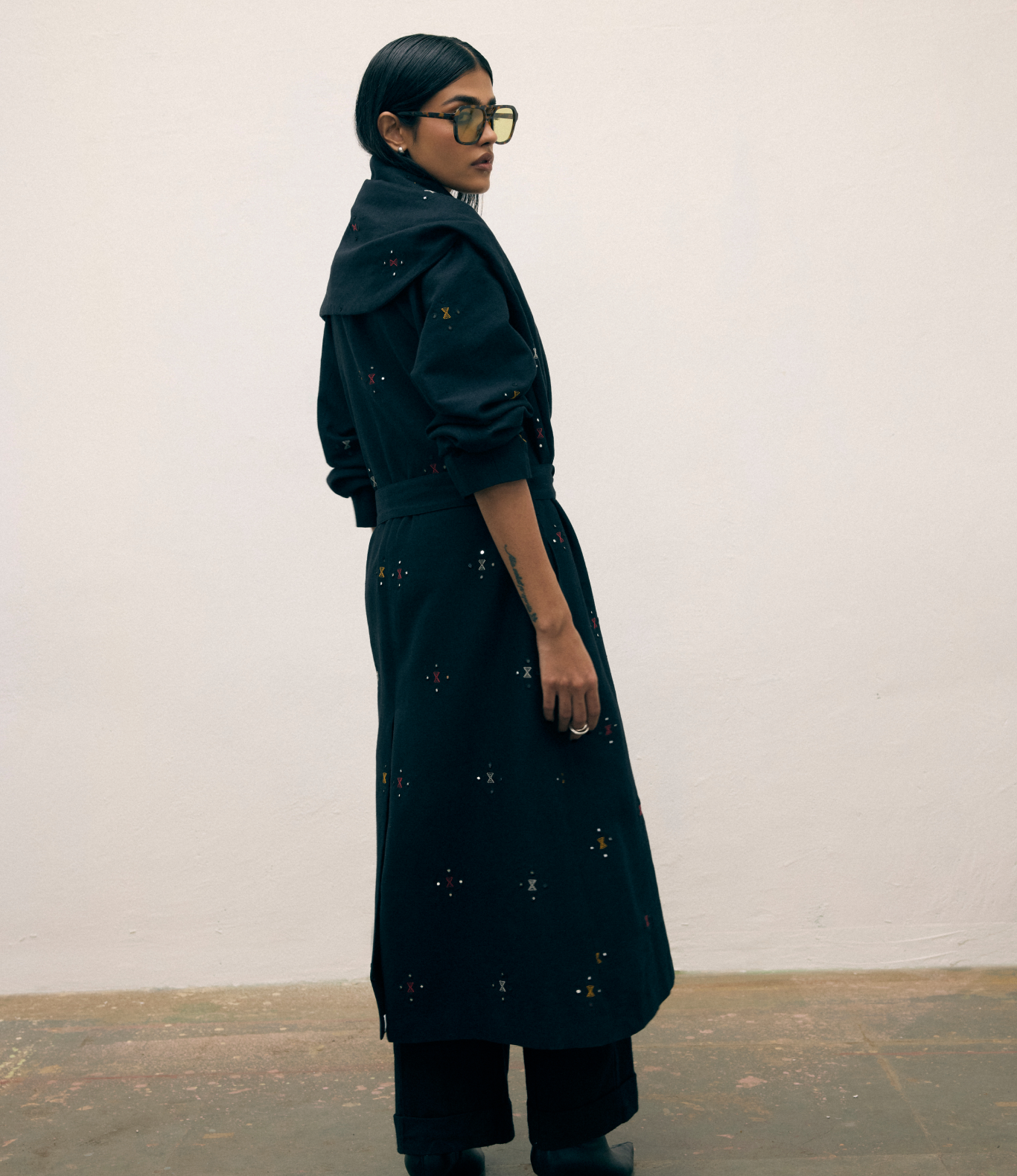 A coat that captures the graceful draping you would see on a saree as an outerwear piece. This elegant piece features a merino wool-cotton blend, skillfully handwoven by Krishna Vankar—one of the pioneering female Kala cotton weavers of Kutch. An alumna of Somaiya Kala Vidya, a school founded by Judy Frater, Krishna brings exceptional craftsmanship to every thread. Merging artisanal heritage with contemporary workwear, this coat embodies both structure and artistry.
