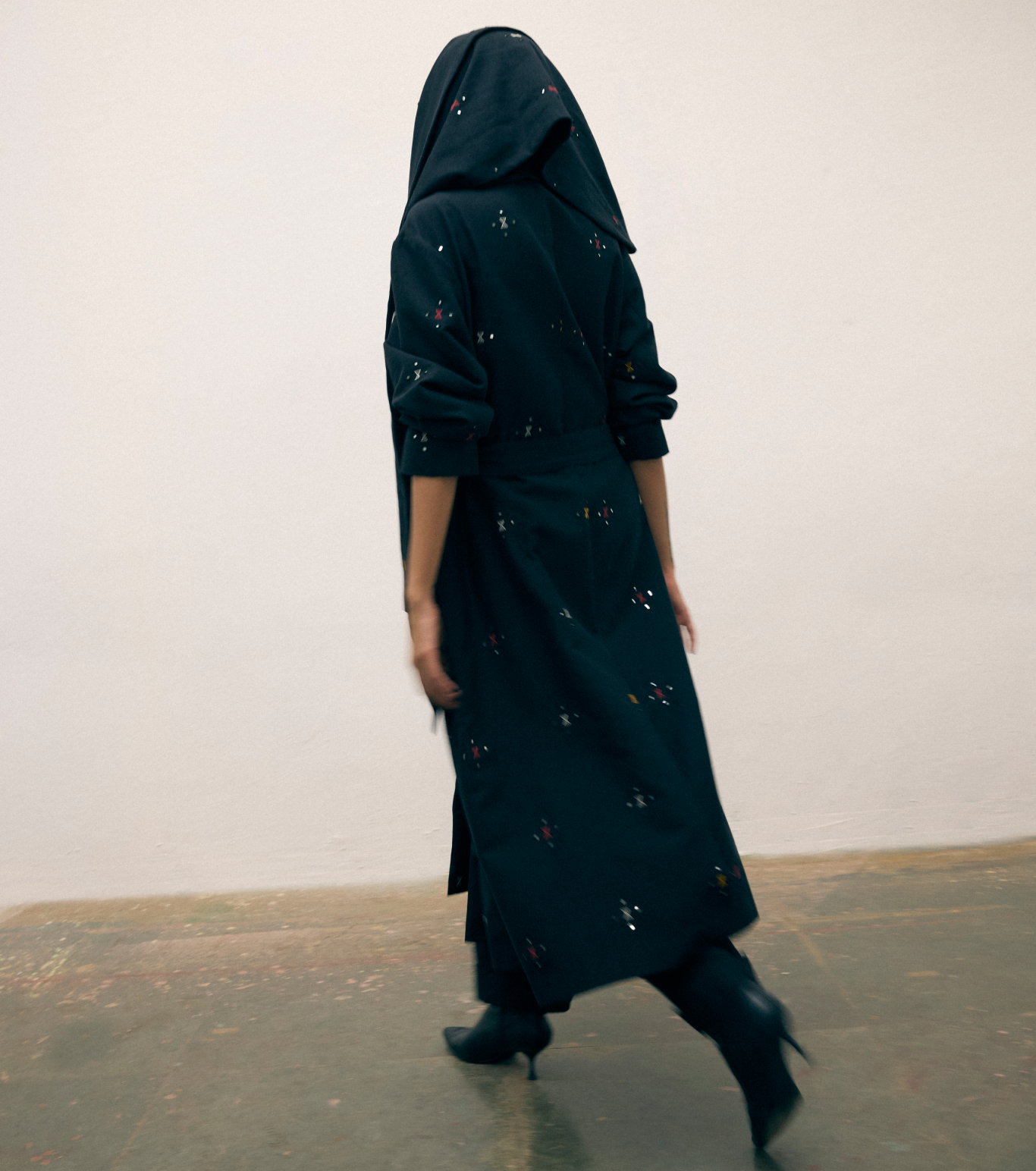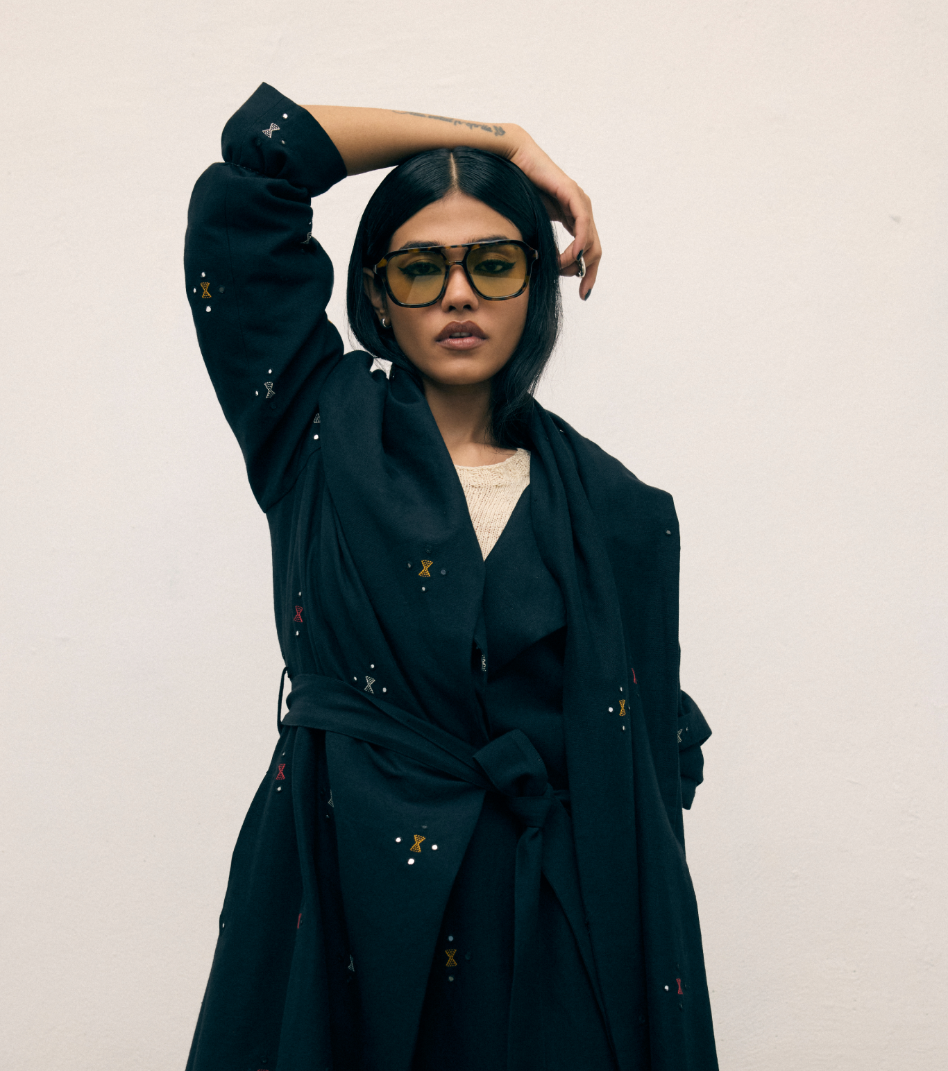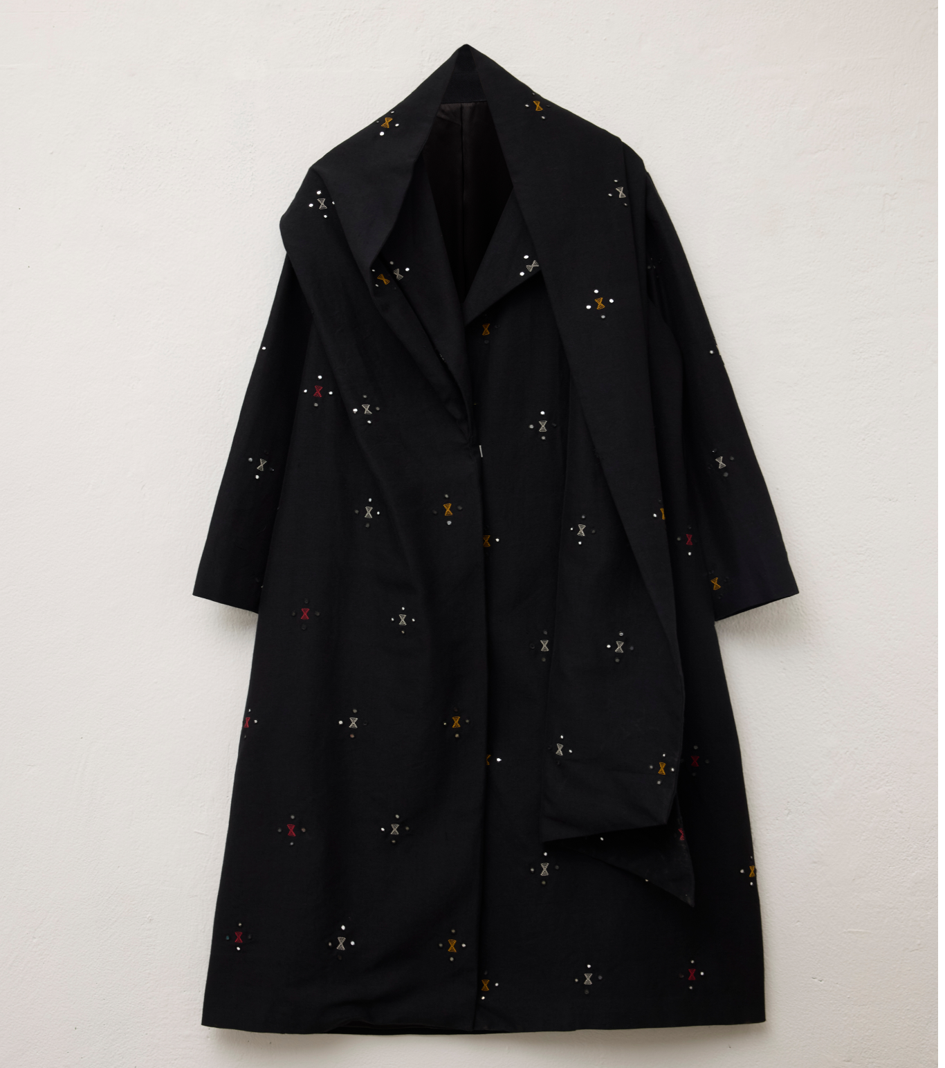 A coat that captures the graceful draping you would see on a saree as an outerwear piece. This elegant piece features a merino wool-cotton blend, skillfully handwoven by Krishna Vankar—one of the pioneering female Kala cotton weavers of Kutch. An alumna of Somaiya Kala Vidya, a school founded by Judy Frater, Krishna brings exceptional craftsmanship to every thread. Merging artisanal heritage with contemporary workwear, this coat embodies both structure and artistry.