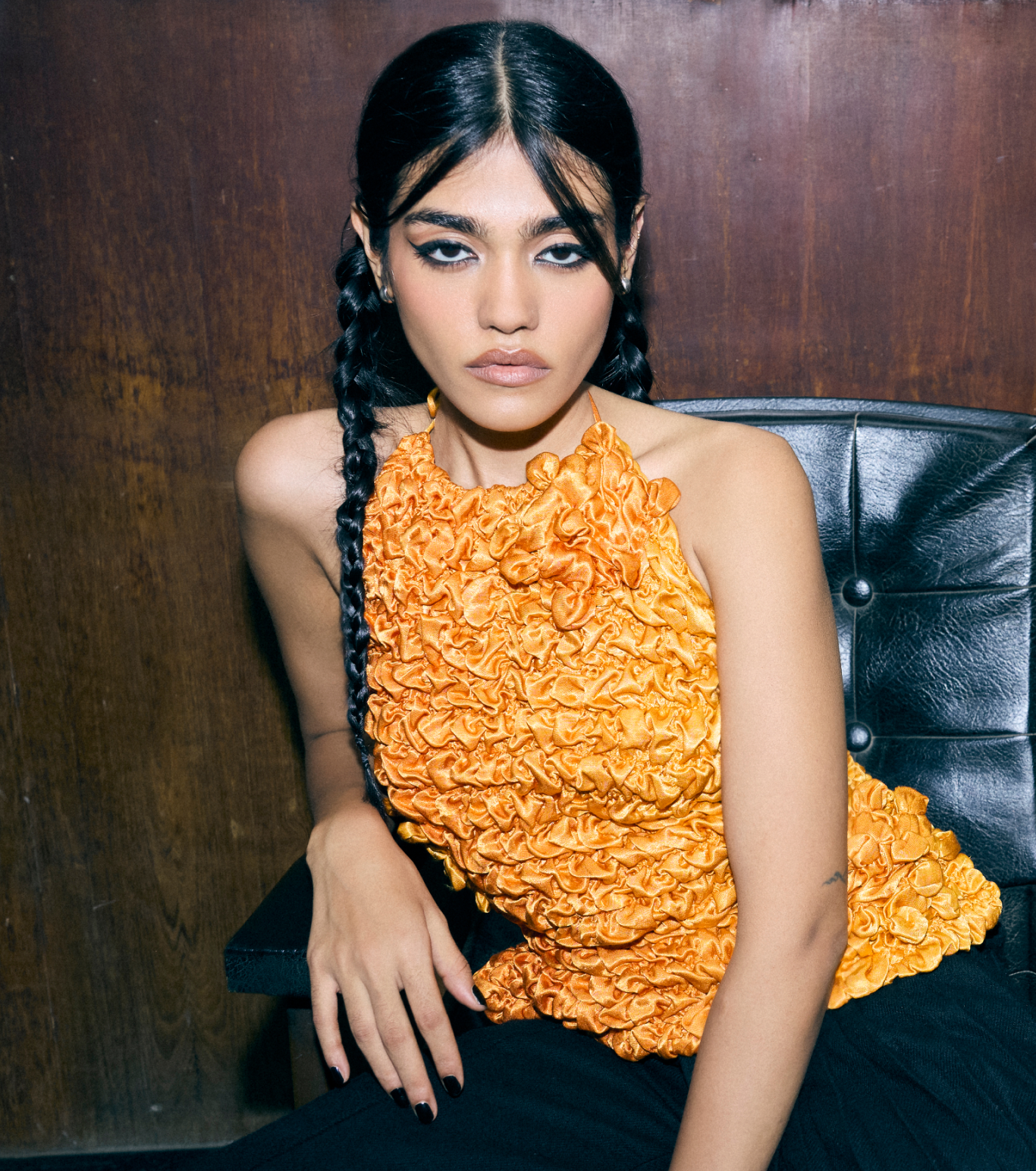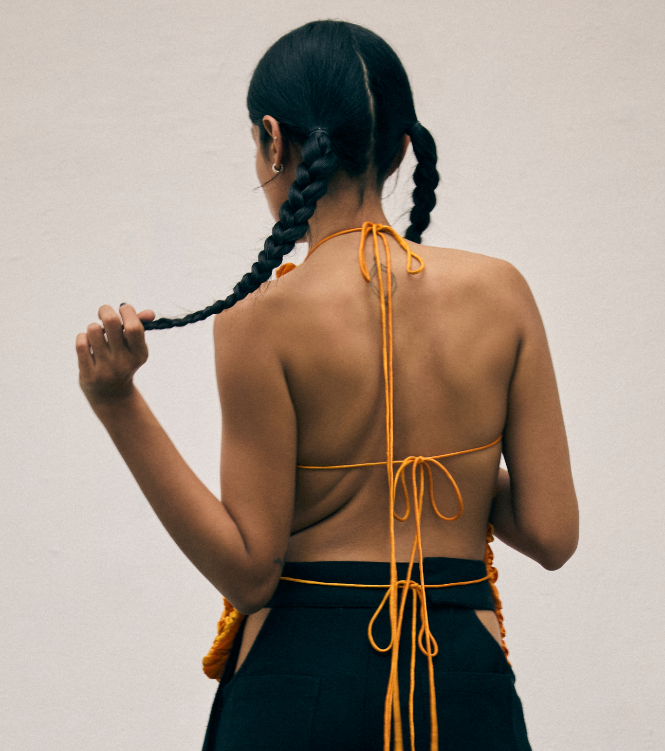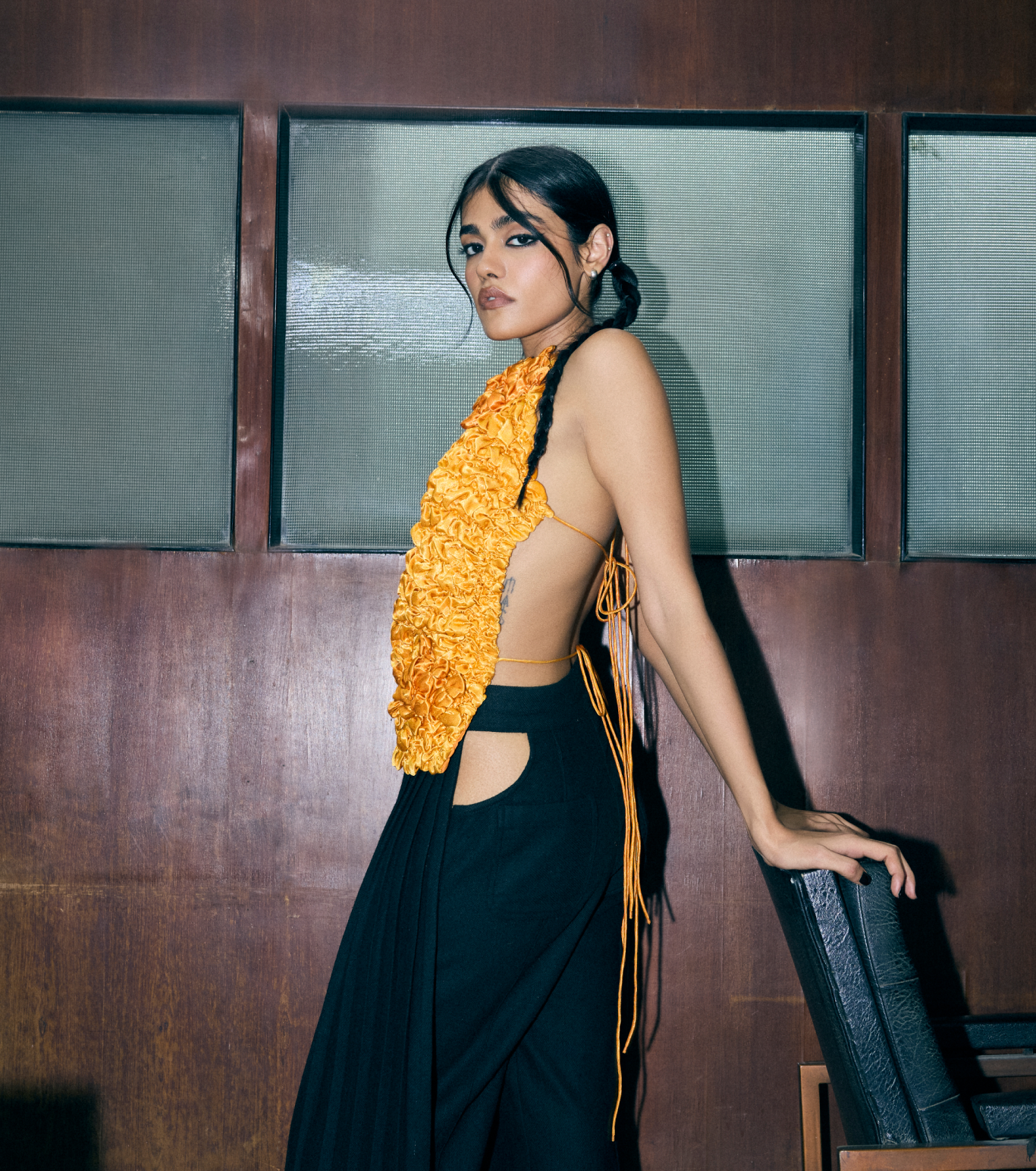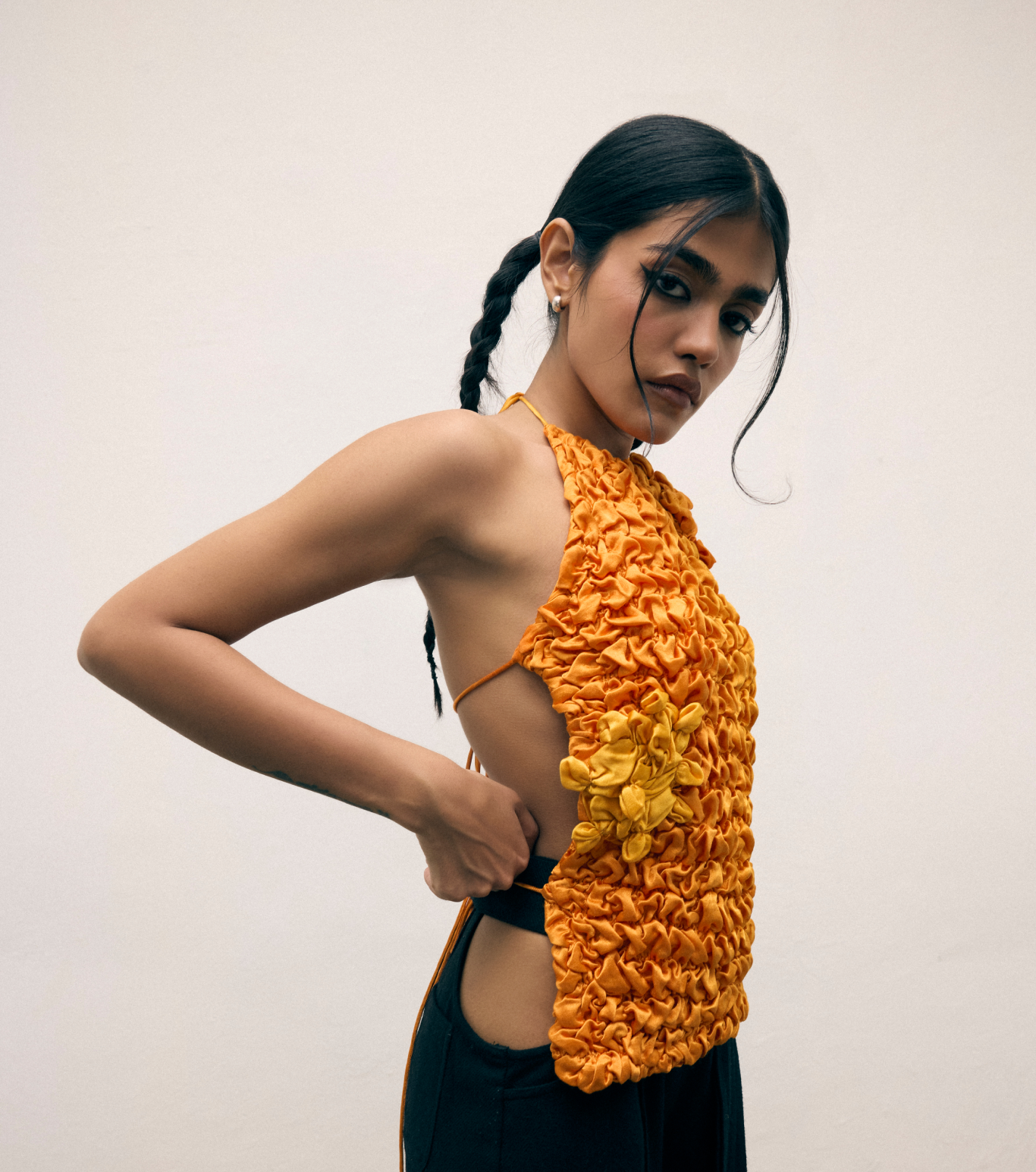 Smocked from vibrantly dyed Mashru silk, this top playfully evokes the form of Indian laddus—only with a bold, backless design. Our Mashru silk is sourced from Amurta Vankar, the only female Mashru weaver in Bhujodi, ensuring both heritage and craftsmanship in every piece.
