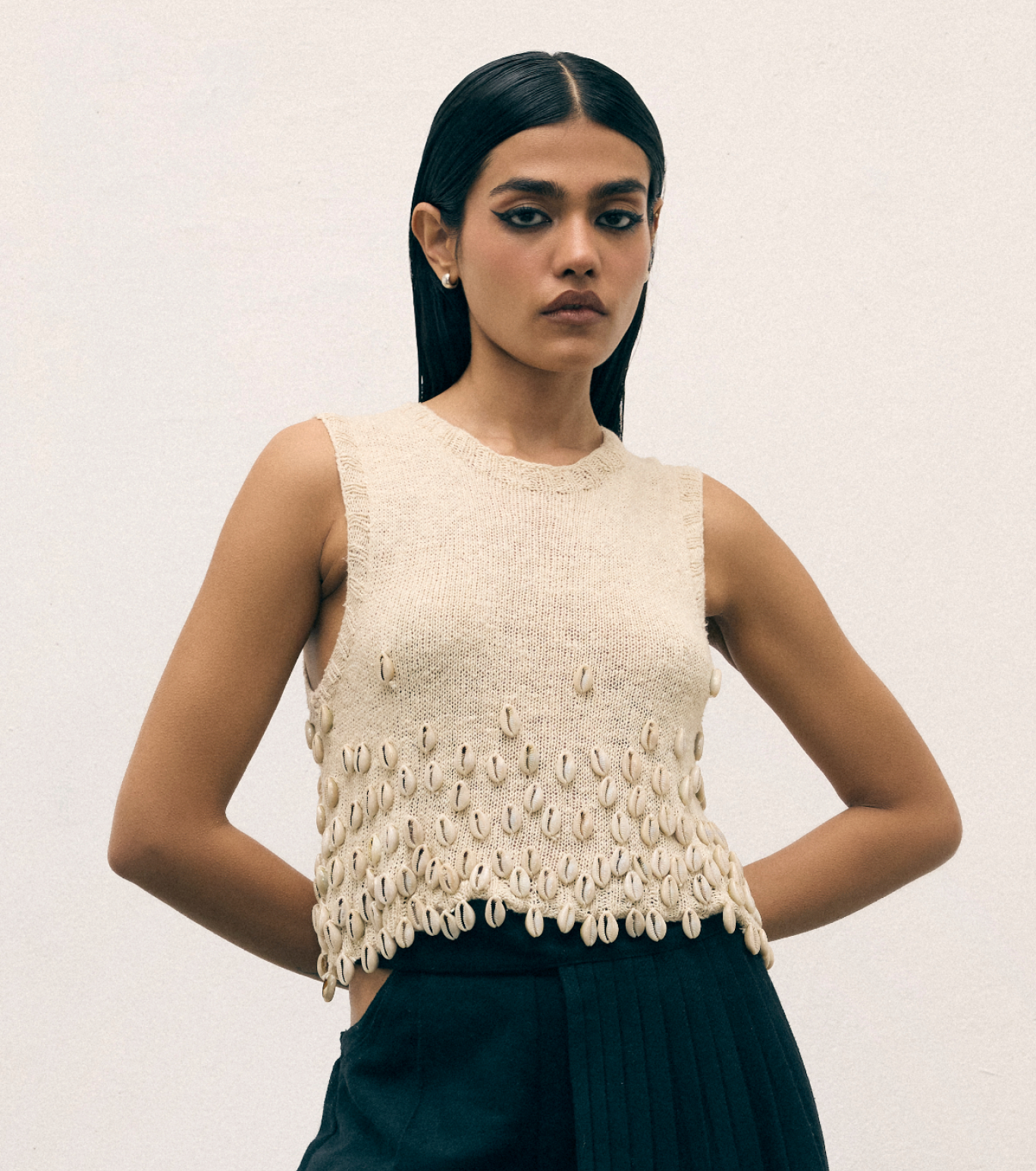 Our hand-knit Eri silk shell top brings the comfort of knitwear to all climates. Sourced from women's groups in Assam, Eri silk is a uniquely Indian textile known for its exceptional softness, breathability, and ethical production—crafted without harming the silkworm. This versatile piece embodies both craftsmanship and sustainability.