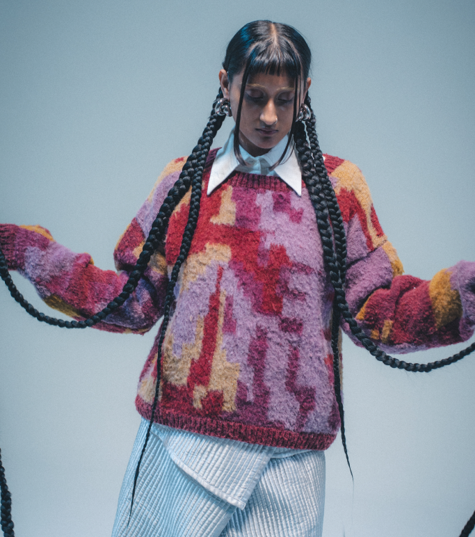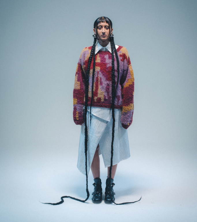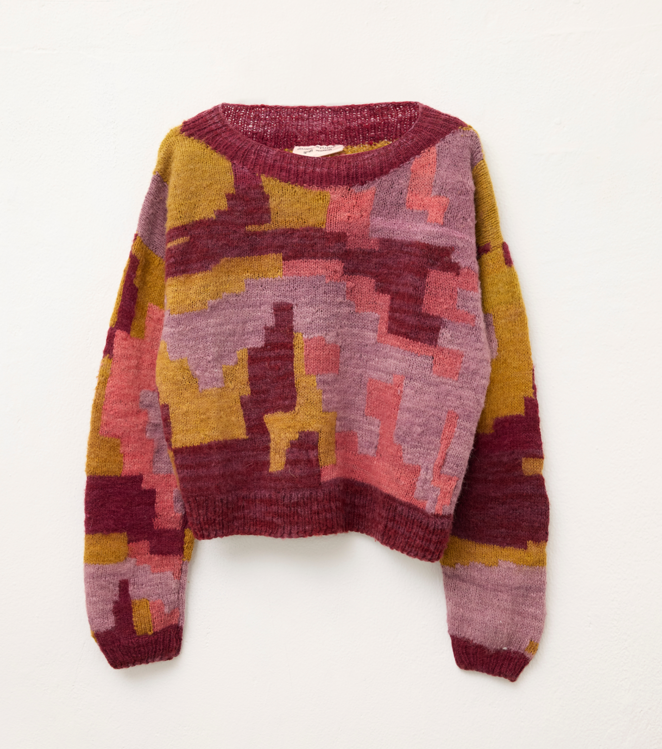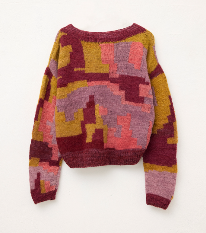 Natural wool can be itchy, pieces are best worn with a layer underneath. The colors from the sweater may bleed onto other clothes because it’s dyed with natural dyes. The model pictured wears size M.
